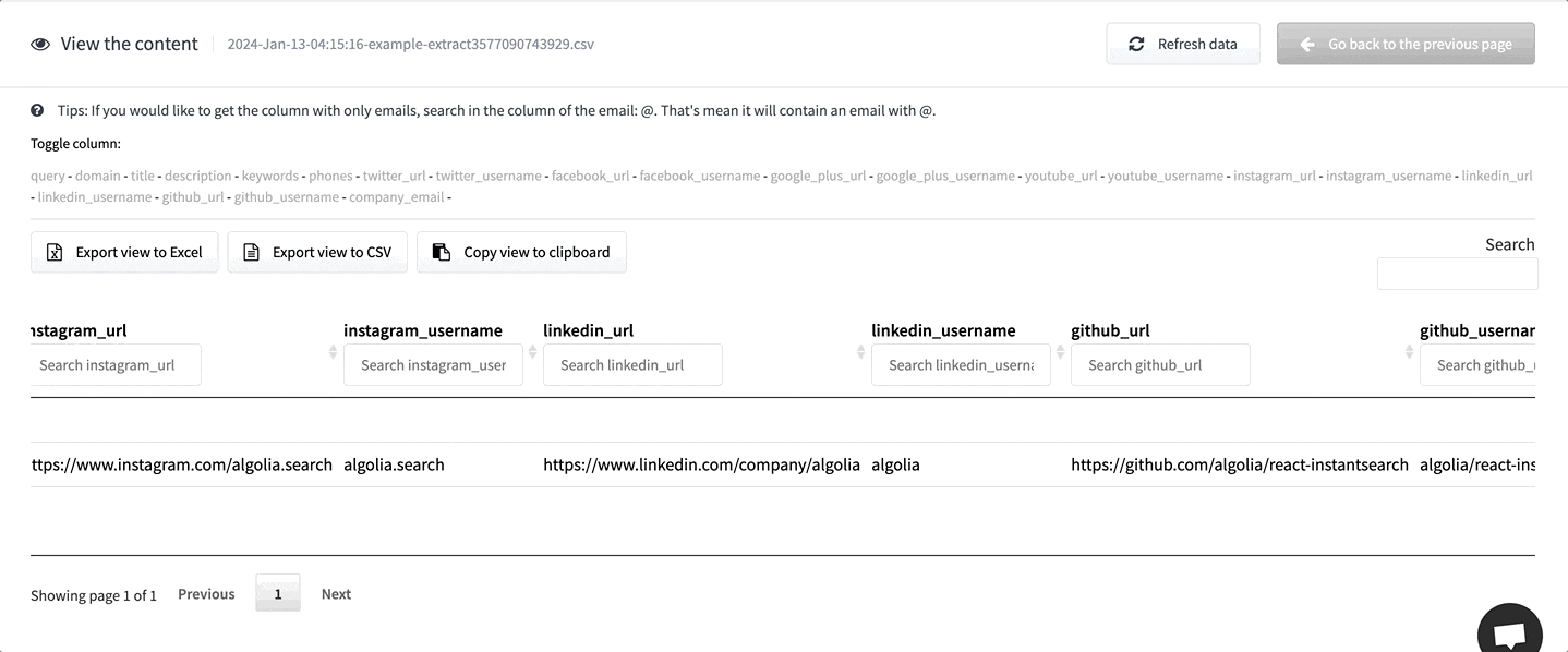 You can upload a list of domains and extract emails, social media URLs, usernames (Facebook, X (Twitter), etc.), and phone numbers from all pages of each website. Once all the emails are extracted, a report can be downloaded as Excel. This is the best solution for extracting all emails from a list of websites (companies).